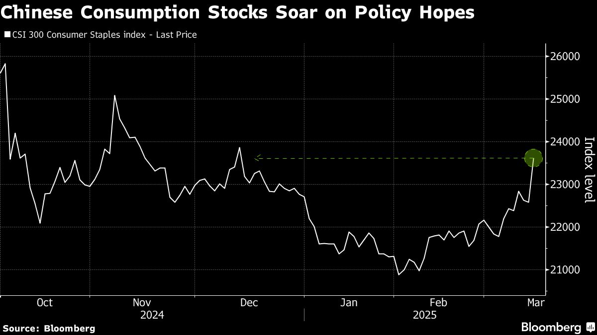 China’s main stock market gauge surged to its highest point this year, driven primarily by consumer stocks amid expectations for increased government backing for the industry.