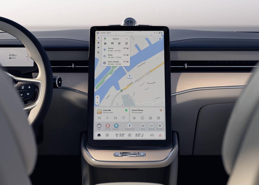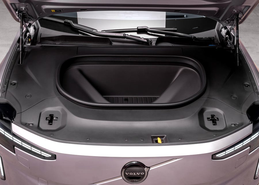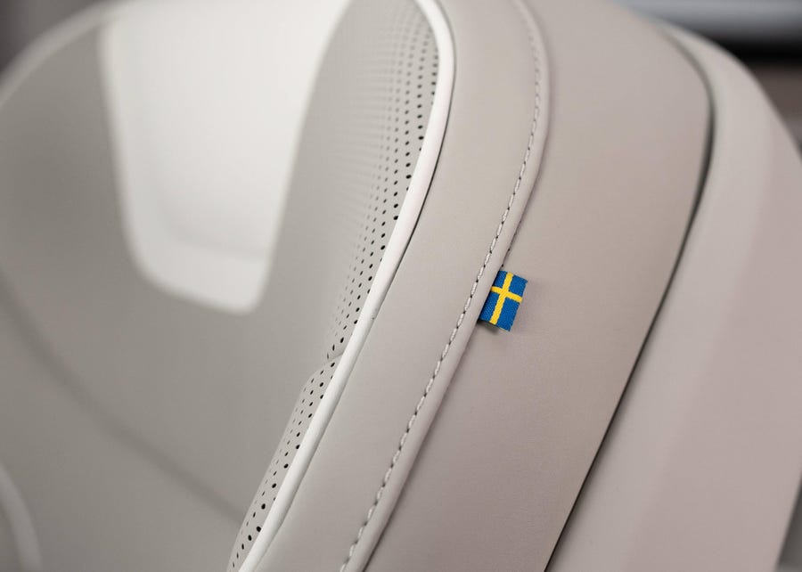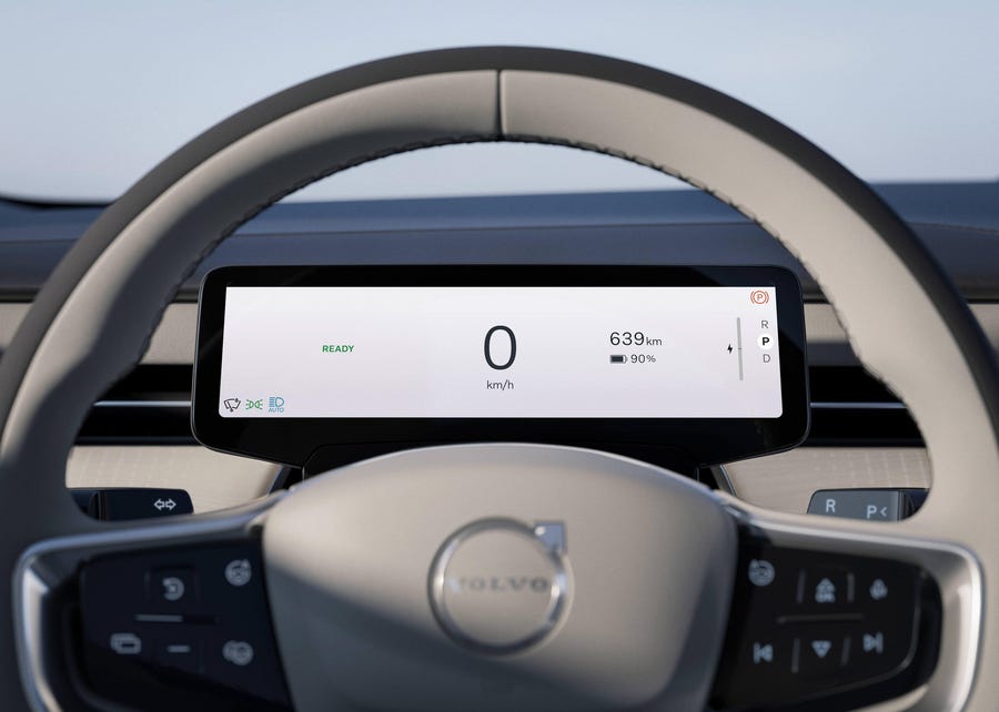 Within, Volvo’s interior showcases a minimalistic and spacious Scandinavian aesthetic enhanced by an available electrochromic panoramic roof that adjusts from nearly fully opaque to completely clear at the press of a button. The electric vehicle features a sleek dashboard featuring a sizable 14.5-inch central touchscreen, along with a 9-inch digital instrument panel. Additionally, subtly integrated for only the driver's use is a heads-up display projected onto the windscreen.